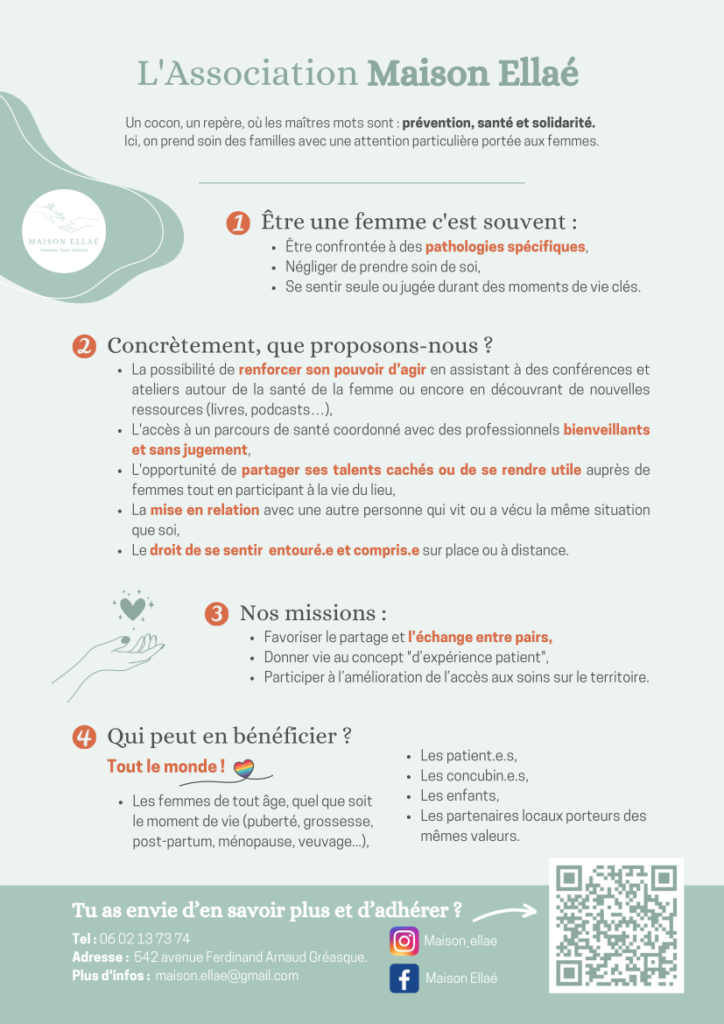 Dans cette structure, on prend soin des familles avec une attention particulière portée aux femmes. Nos missions : favoriser le partage et l’échange entre pairs, donner vie au concept « d’expérience patient » et participer à l’amélioration de l’accès aux soins sur le territoire.